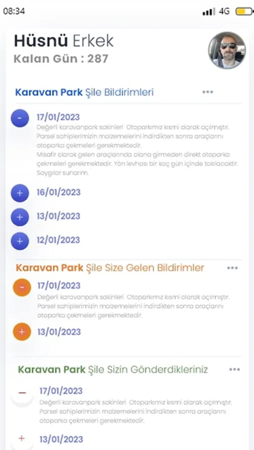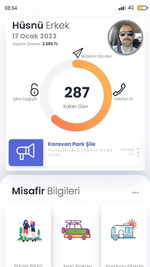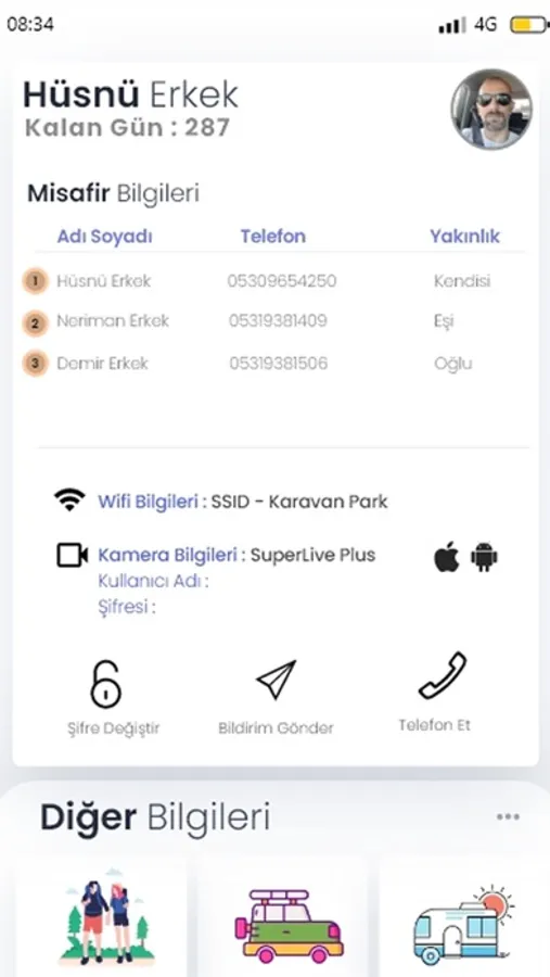 Konaklayanlara ait Parsel Ada Numarası ve Metrekare bilgisi, Konaklayanların Bilgileri, Araç ve Karavan Plaka Bilgilerini, Aylık Elektrik Tüketimlerinin sistemden girilmesi ve ödenebilmesi, Market Siparişlerinin verilebilmesi ve ödeme imkanı, Sözleşme ve Alan Kurallarının kayıt esnasında misafirlere sistem tarafından iletilmesi, Uygulama üzerinden anlık bildirim ve sms gönderebilme imkanı.