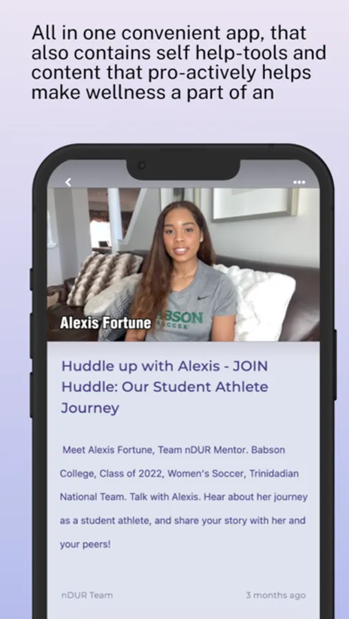 nDUR for Athletes is the app exclusively for NCAA athletes. nDUR connects student athletes in a diverse cross campus community to support each other's well being. nDUR provides a safe, supportive and judgement free space that fosters meaningful connections among student athletes who share similar and unique life experiences. It's a community in which athletes can listen to each other, and openly share their stories, experiences, struggles, and successes. nDUR also provides self-help tools, resources and alerts making wellness part of every athlete's daily routine.