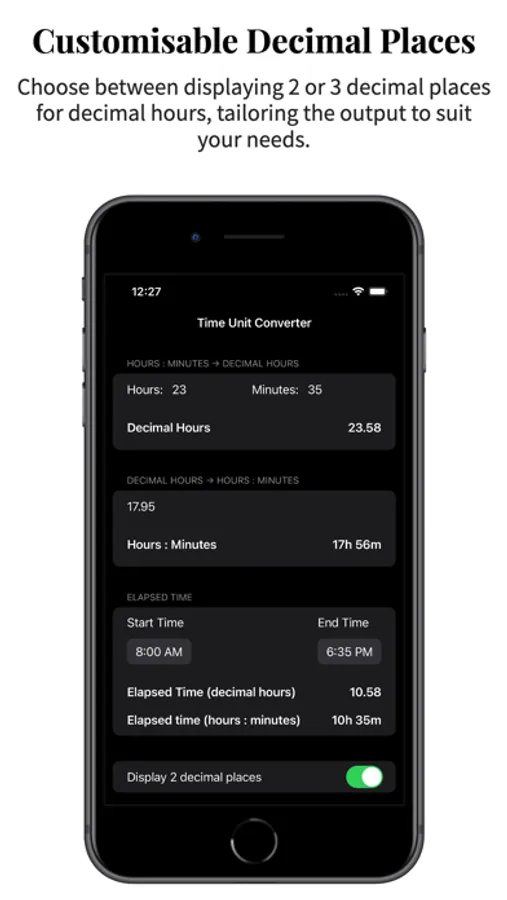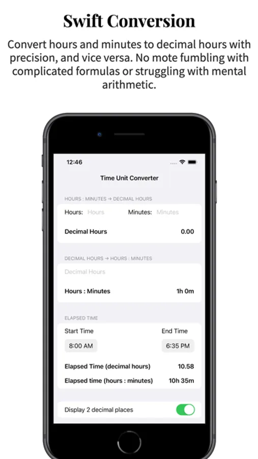 Swift Conversion: Convert hours and minutes to decimal hours with precision, and vice versa. No more fumbling with complicated formulas or struggling with mental arithmetic.