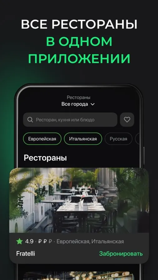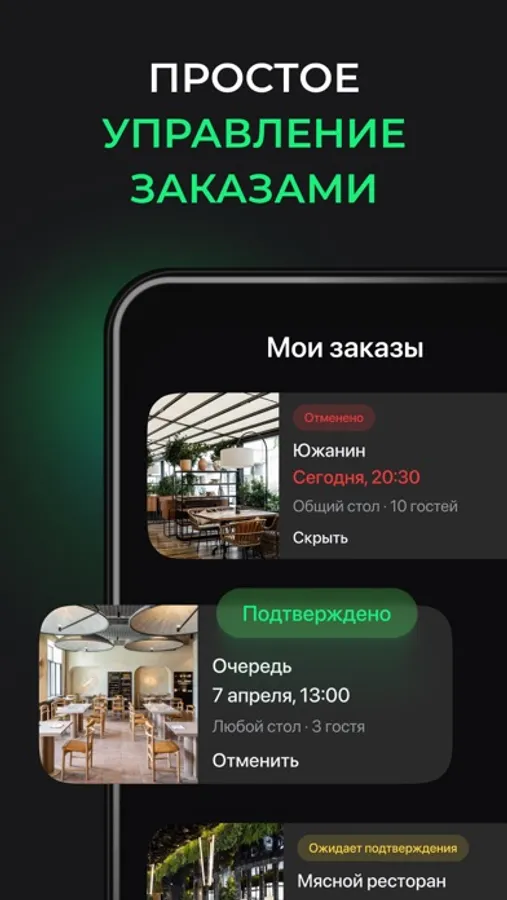 Выбирайте стол в любимом ресторане, в кафе поблизости на карте, по рейтингу других пользователей или по виду кухни - и забронируйте его онлайн максимум в три клика.