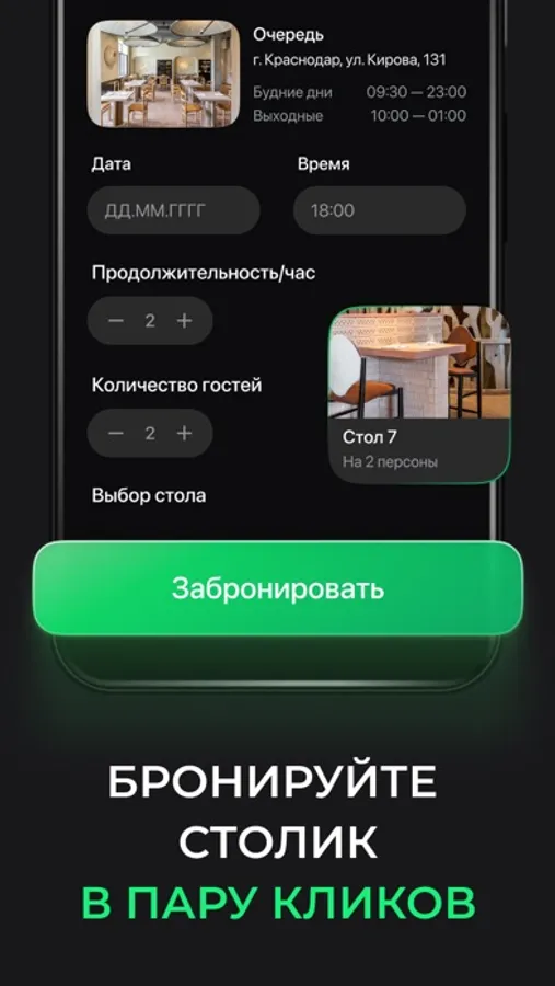 Познакомьтесь в приложении с лучшими местами для отдыха в вашем городе, оцените интерьер, выберите зал и стол по фото.