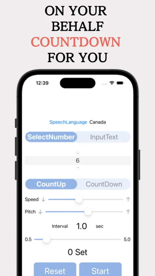 This application is very easy to use and simple to operate. First, set the countdown or countup settings. Next, set the language of the numbers to be read out, and adjust the speed and tone of the reading. Then, set the number of times to repeat the reading from a specific value. Finally, press the Start button to begin counting. As the count progresses, the number to be read out will appear on the screen and you will hear the number in your voice. When the counting is finished, the result is displayed on the screen, and you can start counting again.