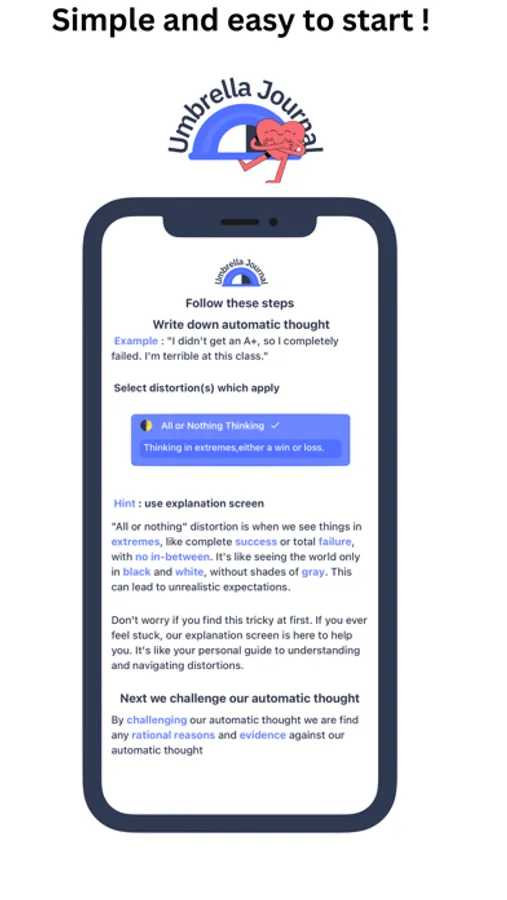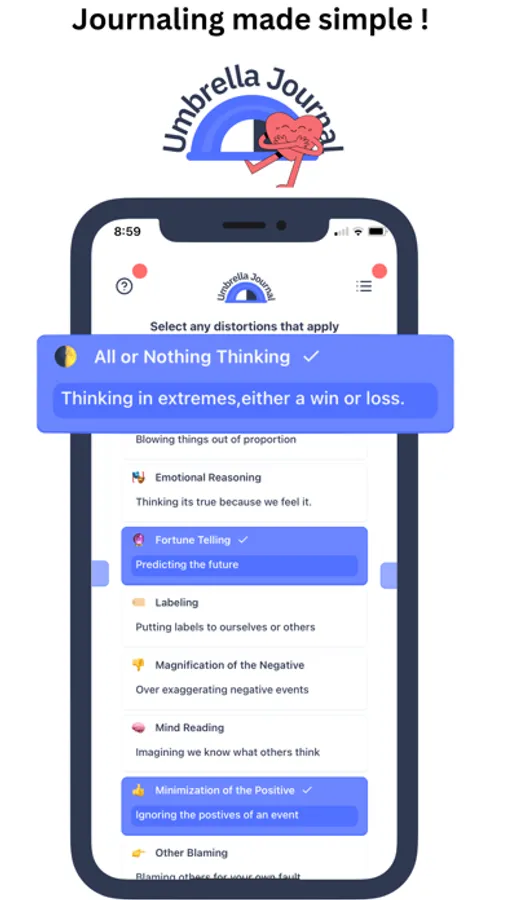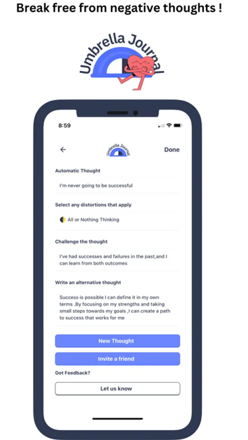Think of Umbrella Journal as your very own pocket therapist, there whenever you need it. With CBT techniques at your fingertips, you can embark on a transformative journey towards emotional well-being and mental clarity.