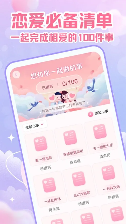 【恋人清单】和TA一起完成相爱的100件小事,完整记录下你们的恋爱日常;