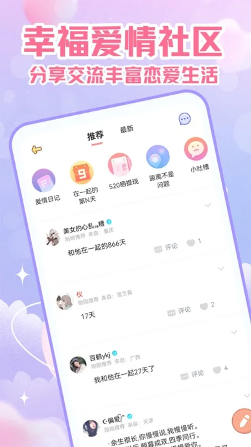【爱情社区】在这里可以分享你和他的恋爱日常,以及你想说的话或者想吐槽的话,也可以看到别人恋爱发言哦;