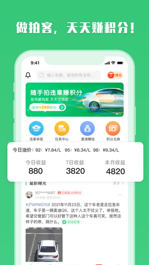 提供随手拍功能,您发现有车辆违章,可以拍下照片,录入车牌,记录下来违章地址,发布之后就可以获得积分奖励;