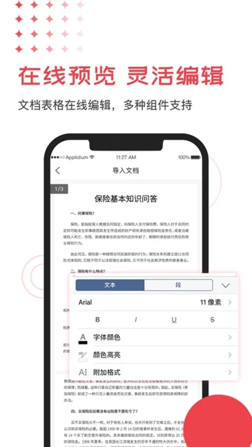 导入文档后,对文档进行在线编辑。可以实时保存编辑内容,不怕文档内容丢失。包含丰富的编辑组件,对内容字符大小、字符颜色、字符格式、段落格式、页面格式等都可进行灵活编辑。支持编辑Word(文档)、Excel(表格)等格式;支持预览PPT(幻灯片)、PDF(便捷文档)等格式。