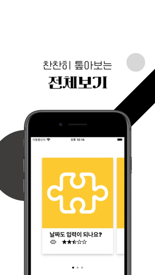 '기본 보기'에서는 화면을 좌우로 밀어 지금까지 작성한 조각들을 시간순으로 탐색할 수 있습니다. 간략하게 제목과 내용, 별점, 카테고리를 표시합니다. 사진이 없으면 안예쁠까봐 제가 또 카테고리를 사진 위치에 대신 넣어드립니다. 요청이 오면 제가 직접 하나하나 조각해서 넣어드리는 건 아니고 카테고리 아이콘이 보이도록 코드를 짰습니다. 모두가 행복한 방법이죠.