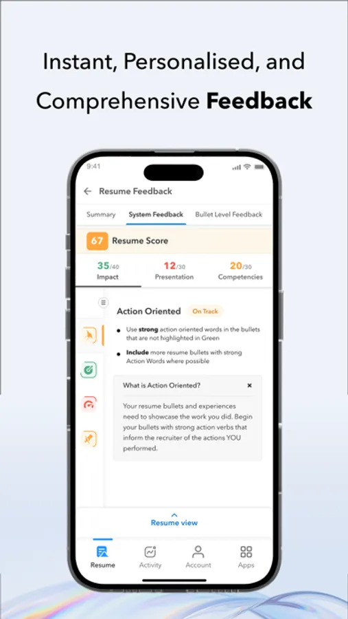 - Get personalized and actionable guidance as well as targeted bullet level insights to power up your resume – on the go