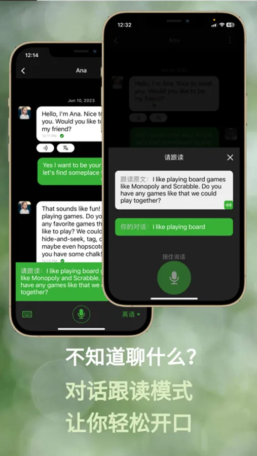4. 对话跟读:启用跟读模式,让每个消息都有参考回复,按参考回复发送语音,还可以评分哦;