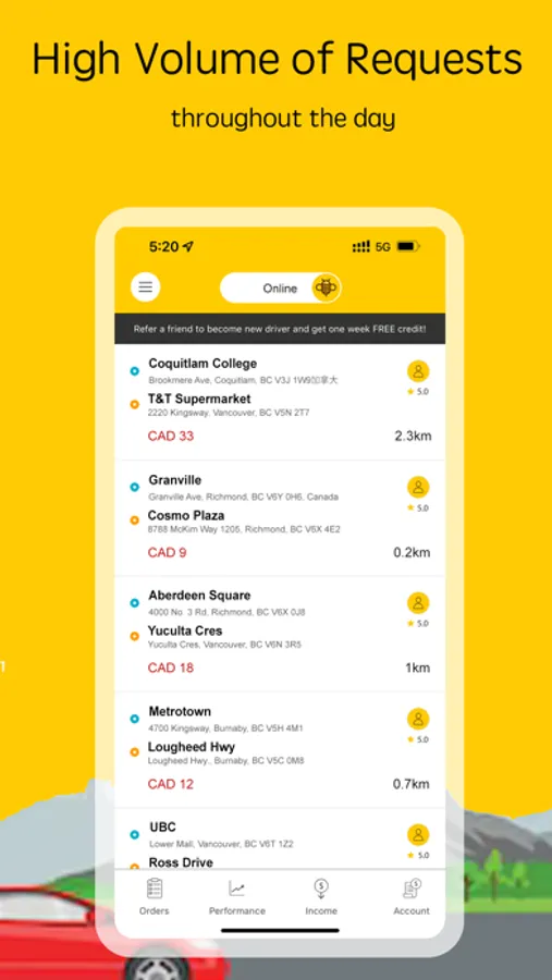 Our app has a large user base, meaning more visibility for you and your services. You'll have access to a steady stream of ride requests, making it easier for you to find and pick up passengers. There's a high volume of ride requests throughout the day.