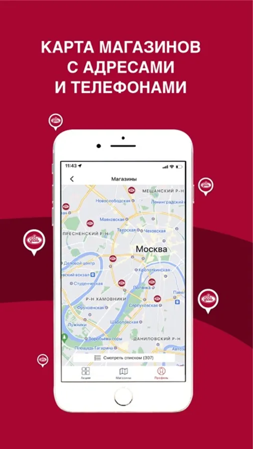 Для Вас всегда в доступе все акции и лучшие предложения на любимую продукцию, а также: индивидуальный статус в программе лояльности и удобная карта фирменных магазинов с адресами, телефонами и графиком работы.