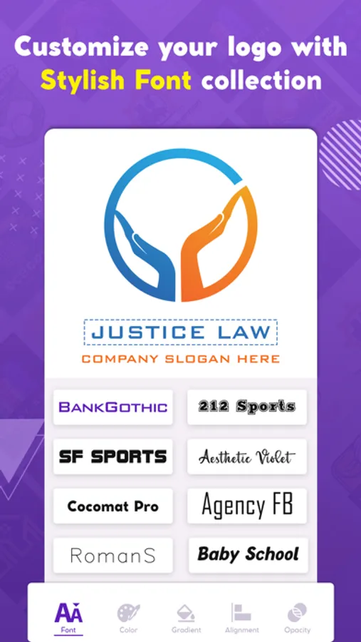 Logo designer app uses several text fonts, apply colors, gradients, shadows & image patterns on text to embellish logo design.