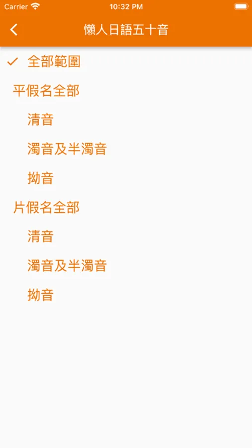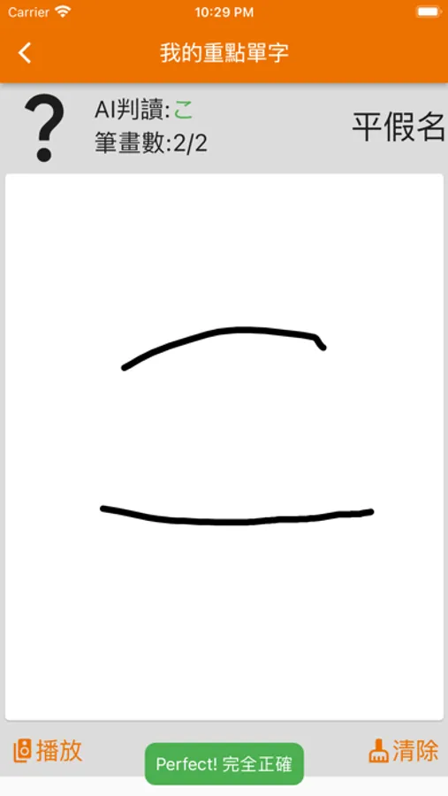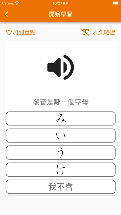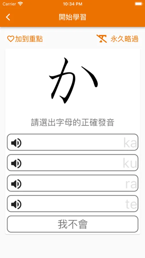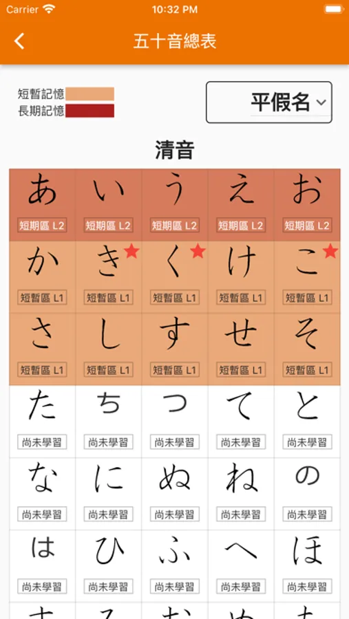 您可以透過五十音圖完整看到每個單字的學習熟悉程度,並且可以點入進行自我記憶,手寫練習,程度分為尚未學習-L10以上表示您已經非常熟悉這個單字了。也可以從這裡把想要多練習的單字加入我的重點單字或標記我會了,讓這個單字不再出現。
