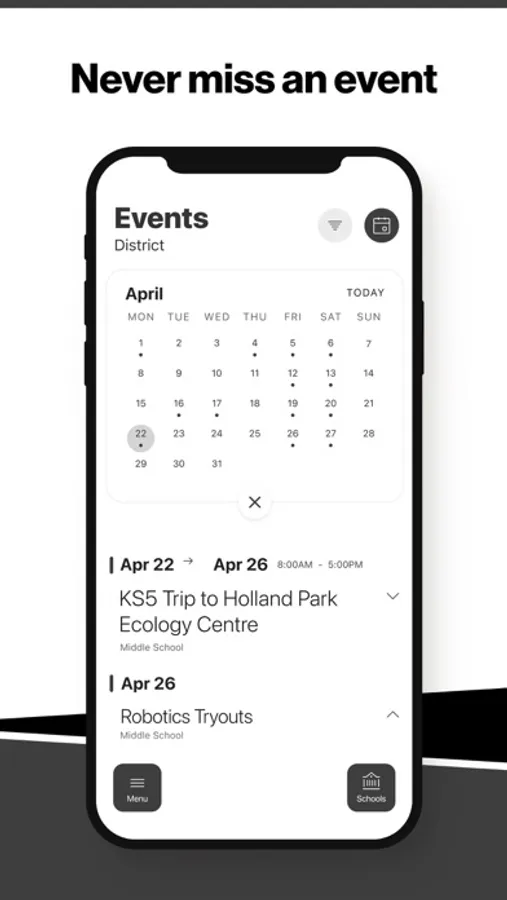 The event section shows a list of events throughout the district. Users can add an event to their calendar to share the event with friends and family with one tap.