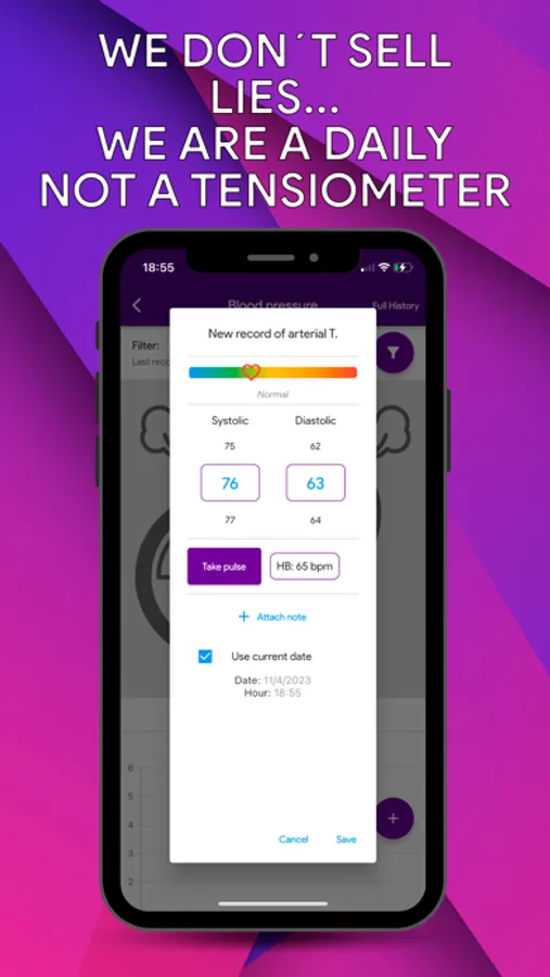 With our app, what you will be able to do is take blood pressure readings for free in Spanish and many other languages. Keep a diary of your readings, review past entries, and send your measurements to your doctor with just one button.