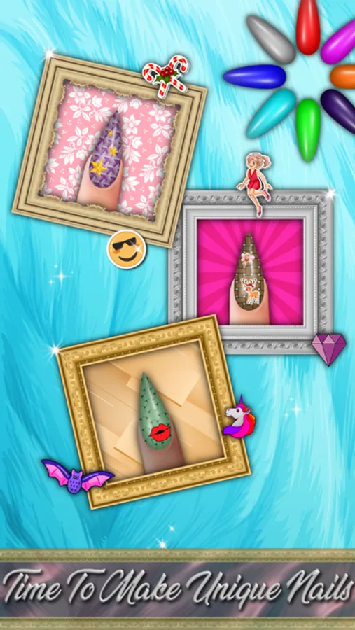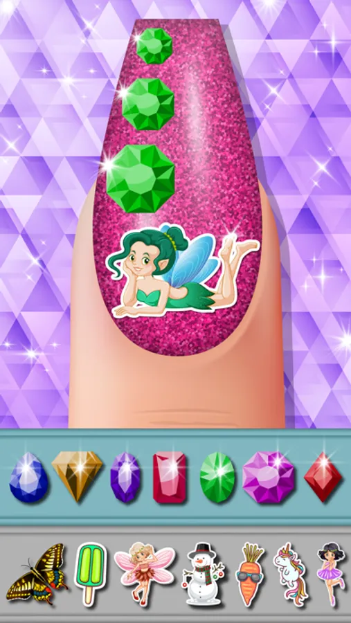 • Rainbow nail polish, stickers, diamonds and glitter to give a glamour look to your hand in acrylic nail salon games: girls fashion games