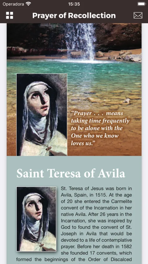 The St. Teresa of Ávila Contemplative Prayer mobile app is packed with features to help you learn and practice St. Teresa’s way of prayer, the Prayer of Recollection, and become more familiar with the teachings of the Catholic Church on Contemplative Prayer.