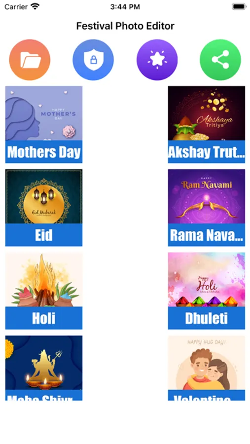 Very easily any one without knowing the the design skill create the Festival Photo Post with own photo in seconds. Here is very simple steps for use of Festival Photo Editor app.