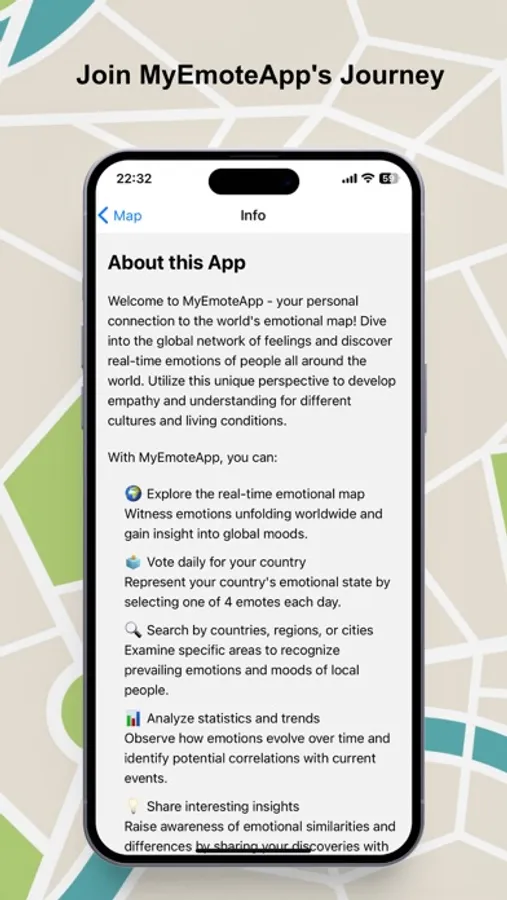 Discover the world's emotions with MyEmoteApp, your personal gateway to a real-time global emotional map! Gain a unique insight into the moods and feelings of people around the world, fostering empathy and understanding for different cultures and life circumstances. Join the MyEmoteApp community in promoting a better comprehension of global emotions and challenges.