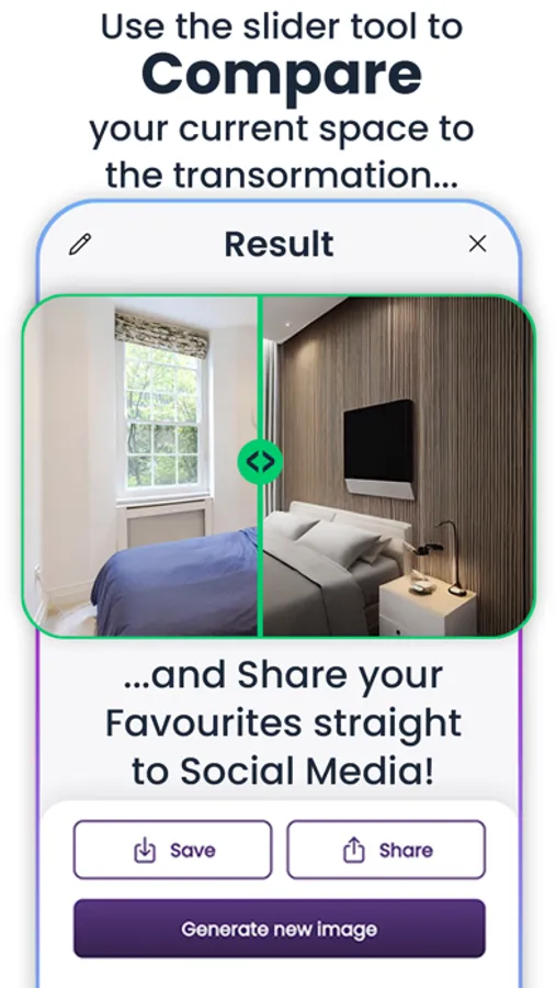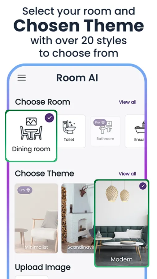 Our app offers a wide range of features to help you create your perfect space. Our extensive room and theme options allow you to easily visualise and experiment with your space in hundreds of variations. Hit generate and let Room AI Transform Your Space in seconds!