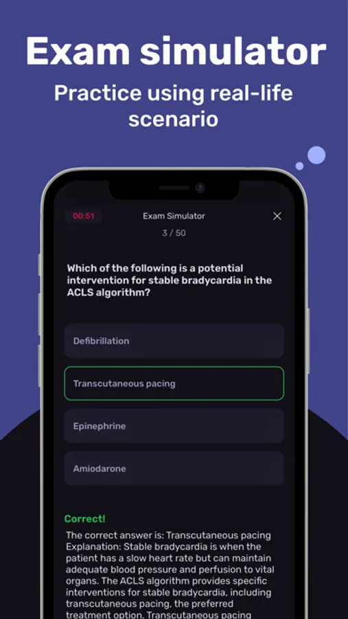 Get your ACLS score prediction based on how you pass the real exam simulator, and study the topics you need to revisit to improve your score.