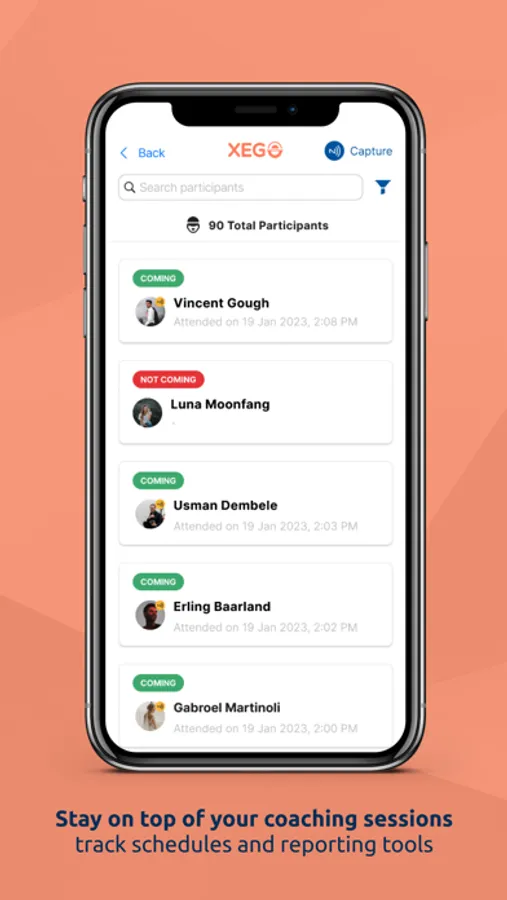 But that's not all! Xego Coach also allows you to view attendance records and generate reports, giving you valuable insights into your participants' attendance patterns and helping you to make informed decisions about your coaching strategies. Plus, with automatic reminders and notifications, you can ensure that your participants never miss an event or practice.