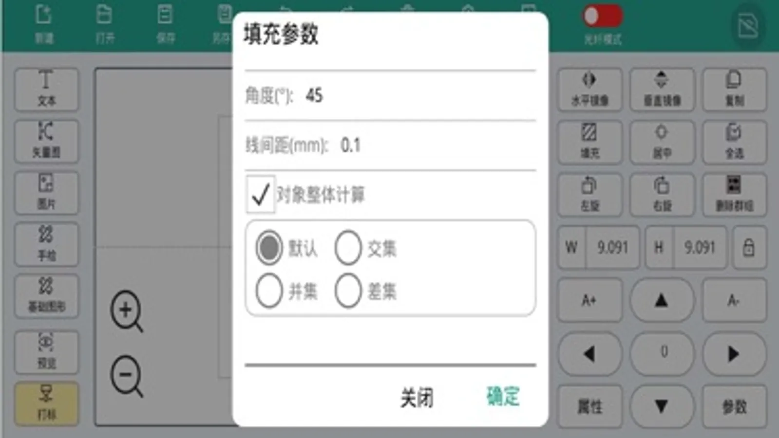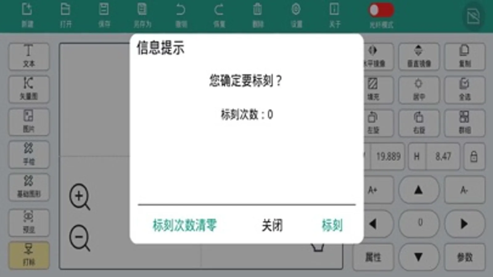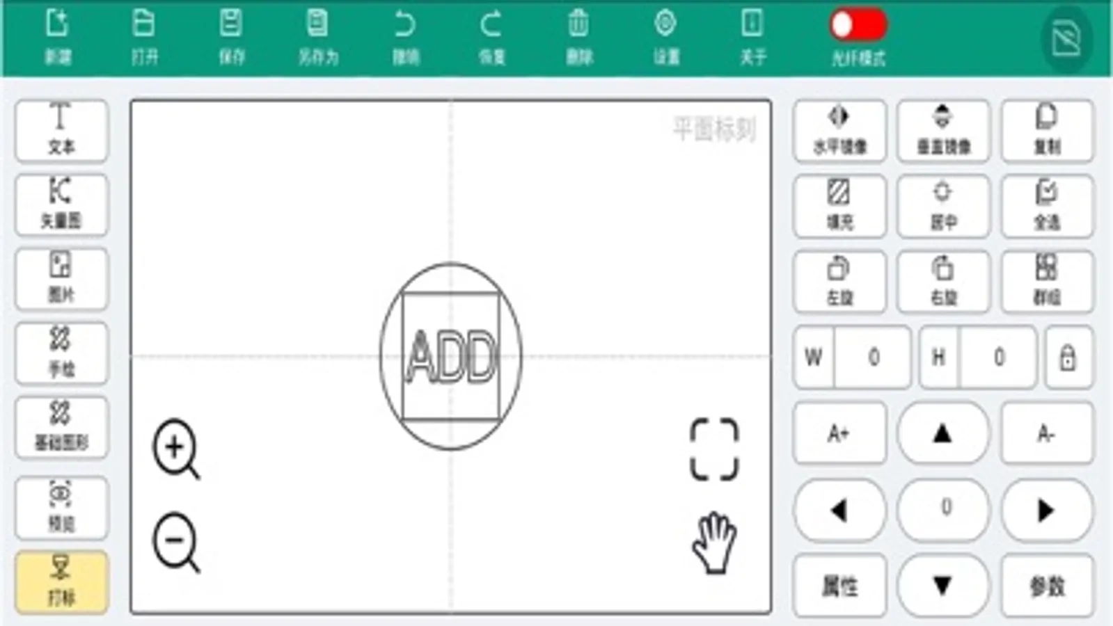 ADD Mark 支持文字,图形,矢量图,图片以及二维码的编辑,并且可对图形进行复制,移动,旋转,镜像,放大,缩小,填充等操作。用户也可快速编辑激光打标文档,通过WIFI传输到设备上进行打标。