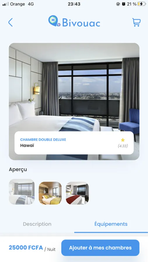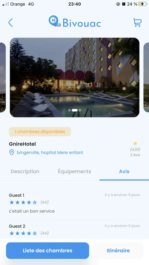 Discover BIVOUAC, our innovative mobile application, designed to locate you easily and offer you the chance to book your favorite nearby hotels and equipped residences with ease, all from your smartphone! Make reservations remotely and pay immediately with ease via mobile money, while our app guides you instantly to your destination thanks to its integrated itinerary system.