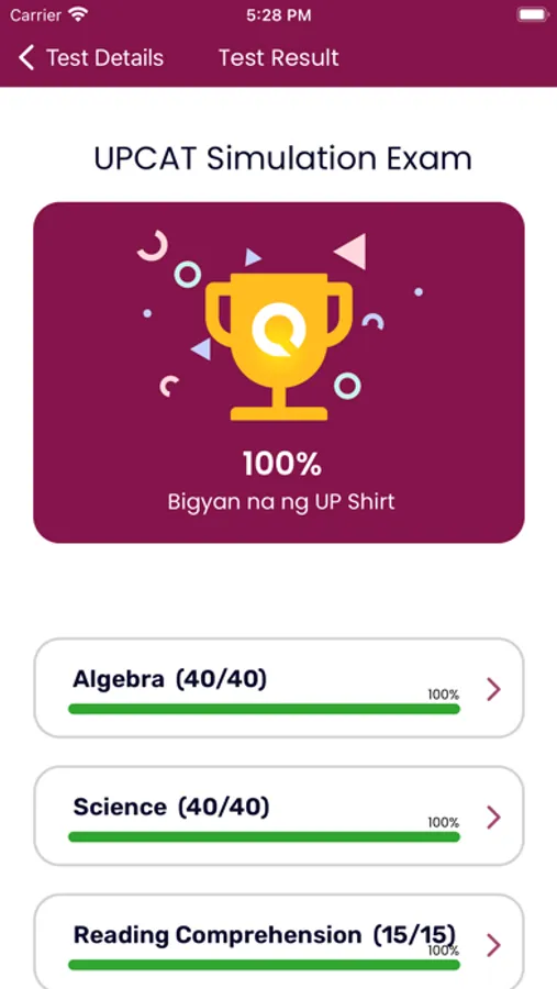 Every retake of the sample exams calls randomized questions so you always practice on a fresh set of questions. Each test or subtest will also have a timer to replicate one of the hardest aspects of the UPCAT and the questions are patterned after real UPCAT questions that have appeared before. You can also opt to pause the exam so that you can do practice tests on short blocks of time.