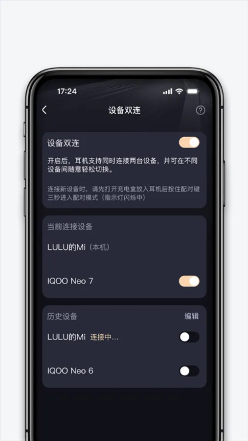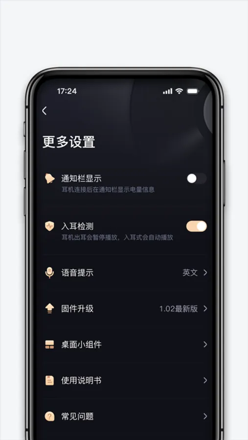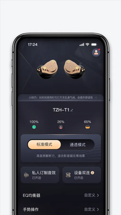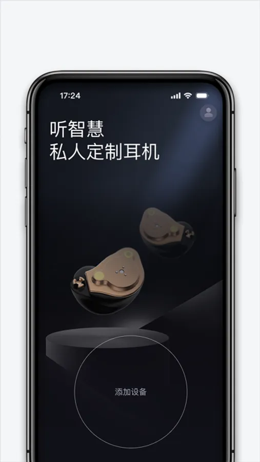 听智慧真定制无线耳机配套App,可以在App中管理耳机设备、升级耳机固件、定制耳机等服务。
