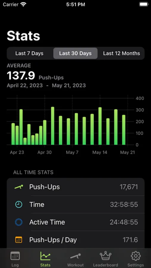 • Progress tracking: Keep track of your progress and stay motivated by checking your recorded stats for every workout, including the number of push-ups completed, time taken, and calories burned.