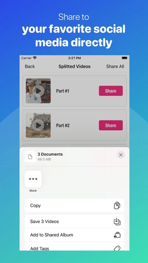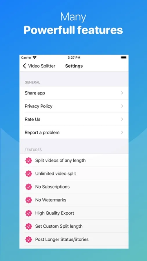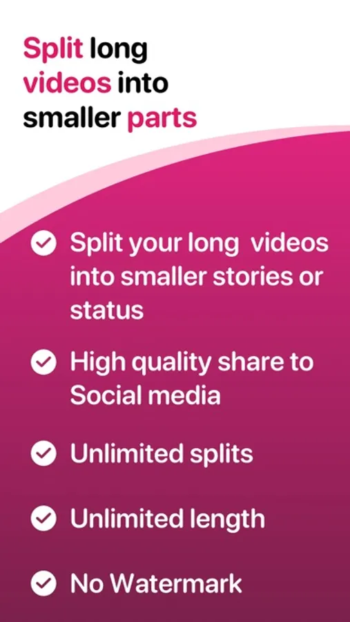 Long Video Status for WhatsApp helps you split your long videos into status/stories, so they can be shared on all social media platforms.