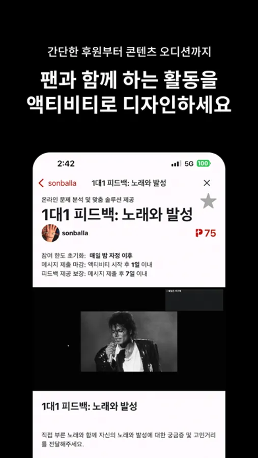 - 간단한 후원부터 커뮤니티 초대, 콘텐츠 오디션까지, 팬과 함께 하는 활동을 액티비티로 디자인해 보세요.