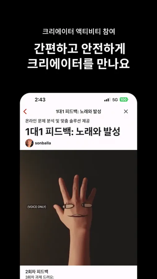 - 크리에이터와 팬 모두 개인정보 노출 없이 안전하게 소통할 수 있습니다.