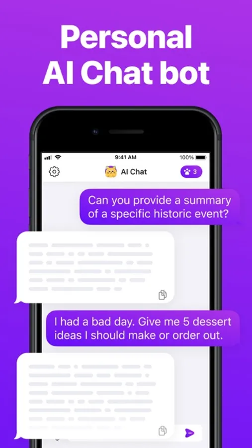 Introducing the ultimate AI Chat Bot: Assistant, Writer – your reliable and intuitive companion for seamless communication! Say hello to an innovative chat AI application that revolutionizes the way you interact and engage with your device. With our state-of-the-art technology you'll experience a new level of convenience and efficiency.