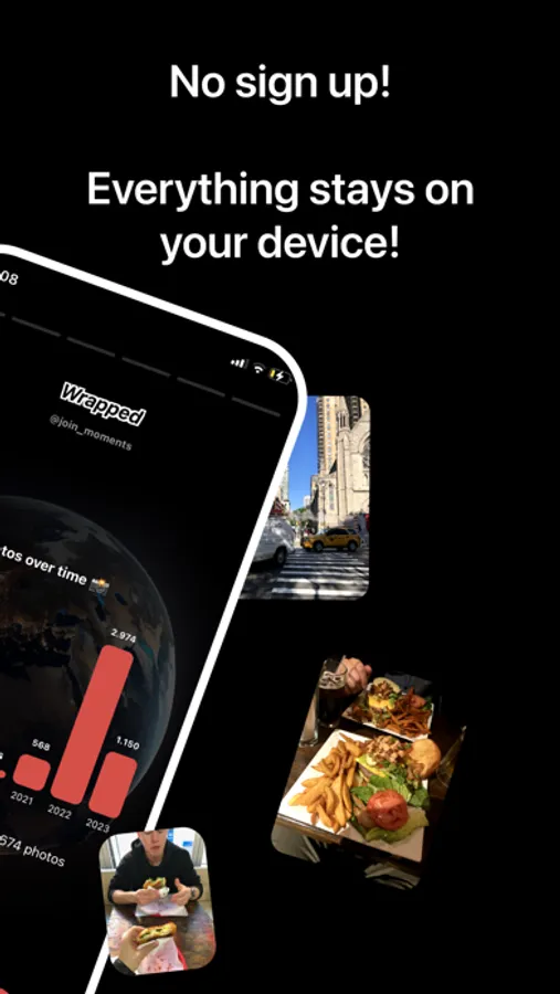 Discover and relive your life's most memorable moments with Moments Wrapped, a unique and privacy-focused app that dives into your personal library to create a stunning report of your experiences. Just like Spotify Wrapped, Moments Wrapped provides you with insights into your world – but we've taken it a step further, making sure everything is done directly on your device without any sign-up or server calls.