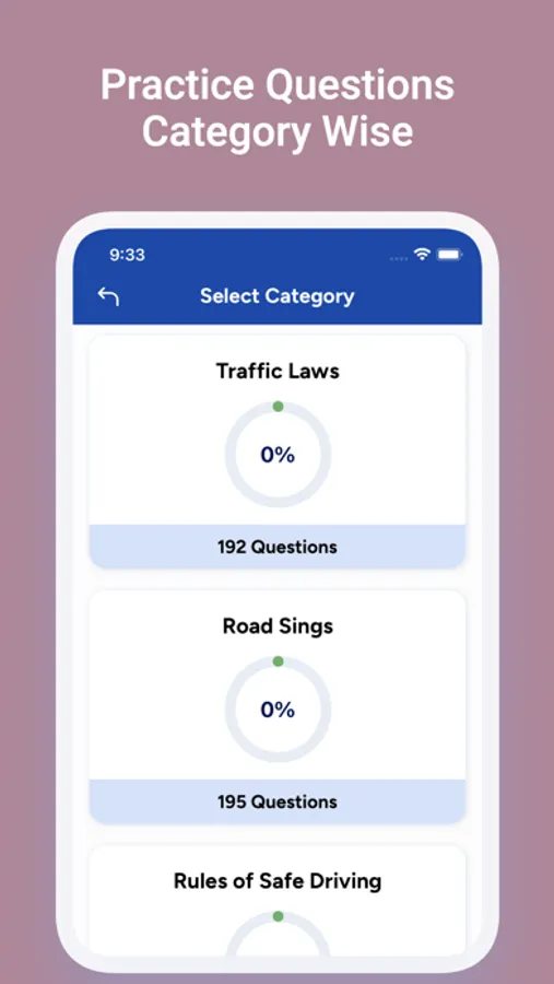 The app includes a practice module that allows to get familiar with questions that fall under different categories like Traffic Rules, Road Signs and Rules of Safe driving. It also keeps track of the progress you have made in each category. It contains questions from following categories: