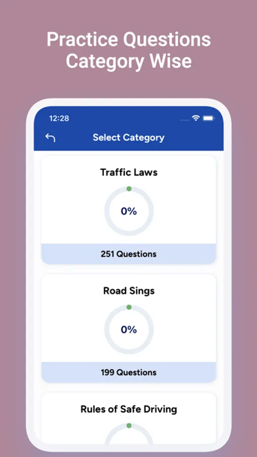 The app includes a practice module that allows to get familiar with questions that fall under different categories like Traffic Rules, Road Signs and Rules of Safe driving. It also keeps track of the progress you have made in each category. It contains questions from following categories: