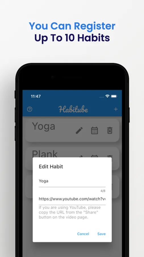 Habitube is a habit-forming app that integrates with YouTube videos and allows users to register up to three habits. Users can easily add new habits and promote habit formation by integrating YouTube videos.