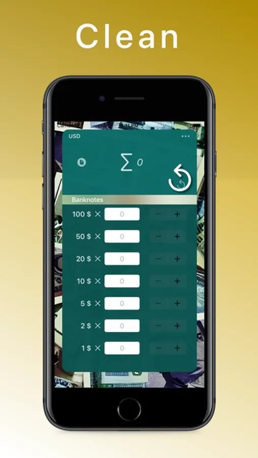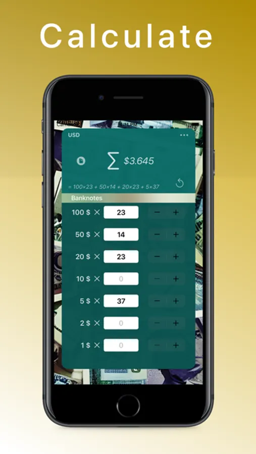 e.g. 100$×23 + 50$×14 + 20$×23 + 5$×37 = ...