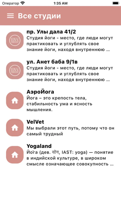 Выбор студии - у нас в приложении вы можете легко найти ближайшую к вам студию йоги. Мы сотрудничаем с качественными студиями по всей стране, чтобы вы могли выбрать место, наиболее удобное для вас. Каждая студия предлагает комфортное пространство для занятий, оснащенное всем необходимым оборудованием, чтобы вы могли погрузиться в мир йоги.