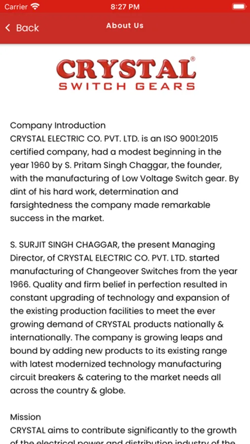 CRYSTAL ELECTRIC CO. PVT. LTD. is an ISO 9001: 2008 certified company, had a modest beginning in the year 1960 with S. Pritam Singh, the founder, with the manufacturing of Low Voltage Switchgears. By dint of his hard work, determination and farsightedness the company made remarkable success in the market.