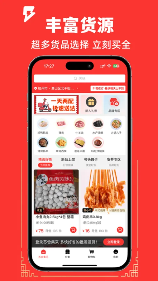 批发进货就上苏合集采!苏合集采提供一站式快消品批发进货服务,更多的商品选择,一日两配的配送效率,三道质检程序确保产品质量,平均省钱20%以上。