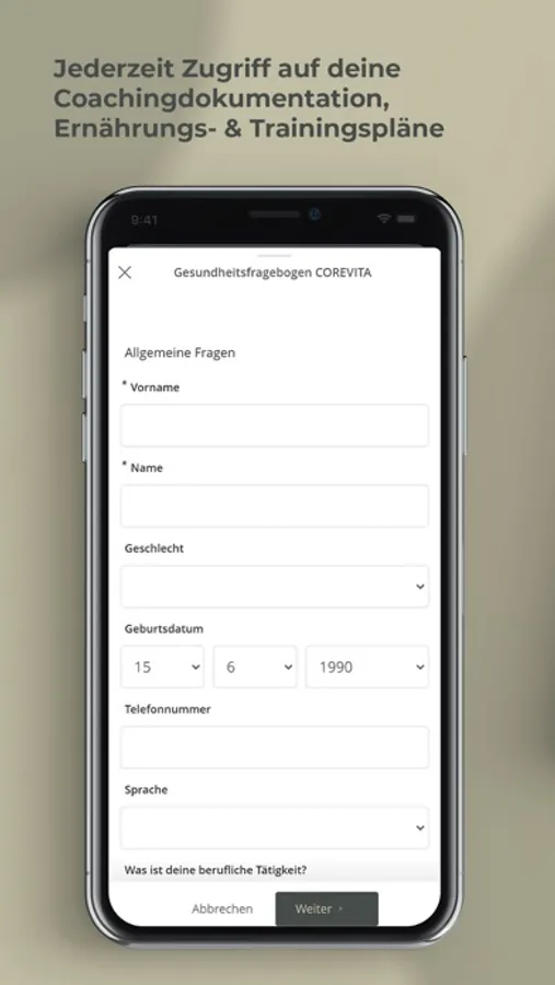 • Jederzeit und von überall Einsicht auf deine Coachingdokumentation und die individuellen Ernährungs- und Bewegungspläne.