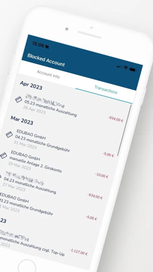 The myEDUBAO app gives you access to detailed information about your booked German Blocked Account. Follow your KYC status, get your current balance, see your transactions and personal information.