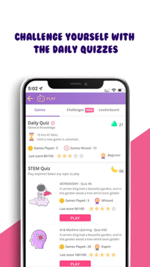 - Daily Quizzes & Challenges: Tickle your brain cells by playing a quiz or creating a challenge for your friends.