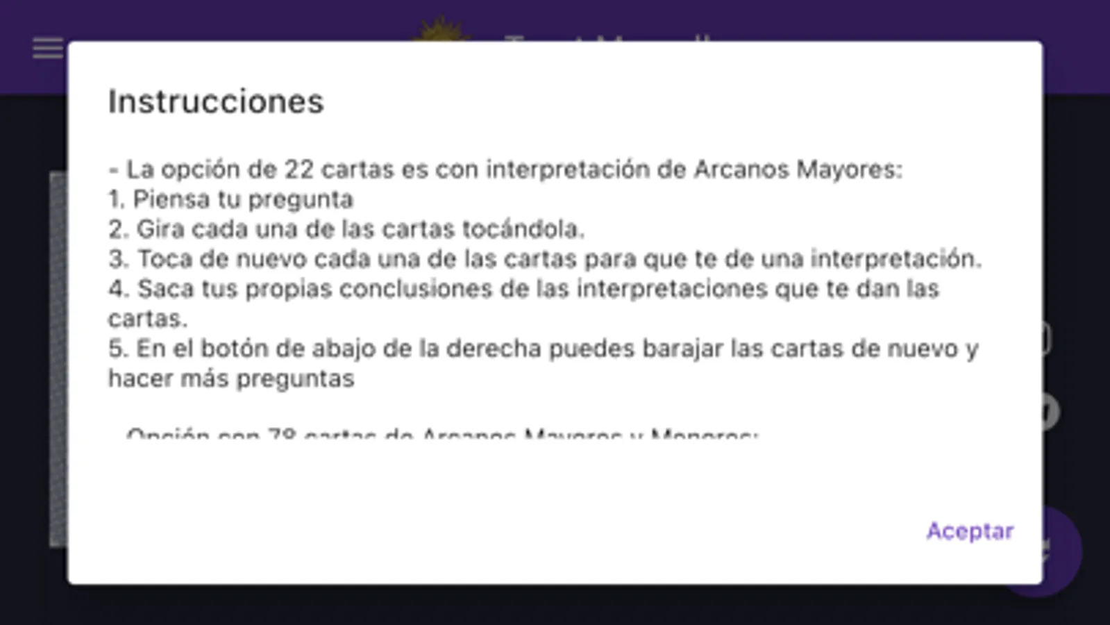 Al abrir la aplicación, encontrarás una interfaz sencilla e intuitiva que te guiará en el proceso de realizar una pregunta y seleccionar tres cartas para obtener una lectura de tarot personalizada. Simplemente escribe tu pregunta en el cuadro de texto proporcionado y elige si deseas utilizar un mazo de 22 cartas (Arcanos Mayores) o de 78 cartas (Arcanos Mayores y Menores).