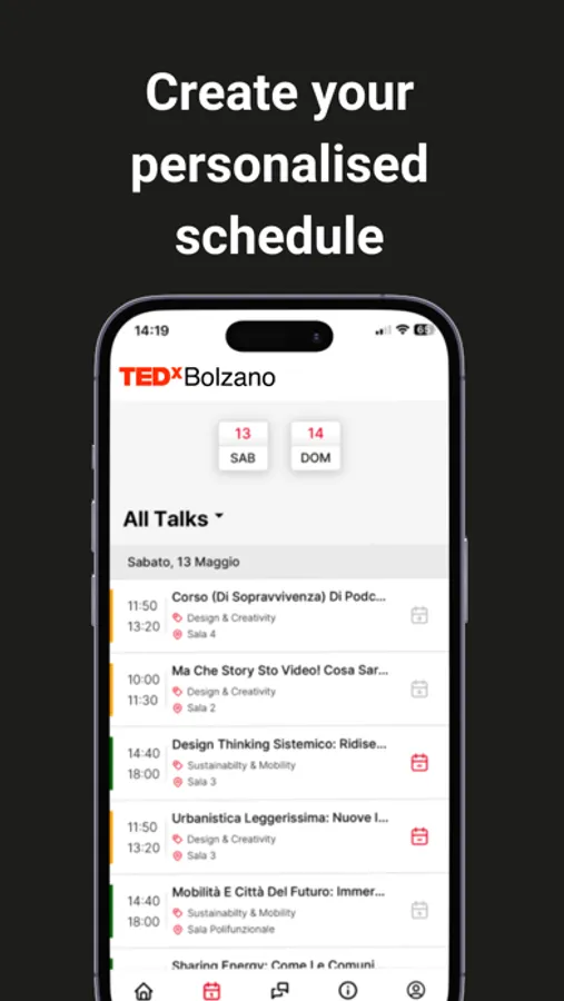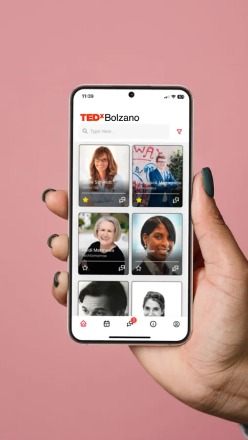 Con la app del TEDxBolzano potrete accedere a tutte le informazioni relative all'evento, come gli orari delle presentazioni, gli speaker, le informazioni sul luogo dell'evento e tanto altro ancora. Inoltre, potrete entrare in contatto con tutti i partecipanti dell'evento grazie alla funzione di networking integrata nell'app.