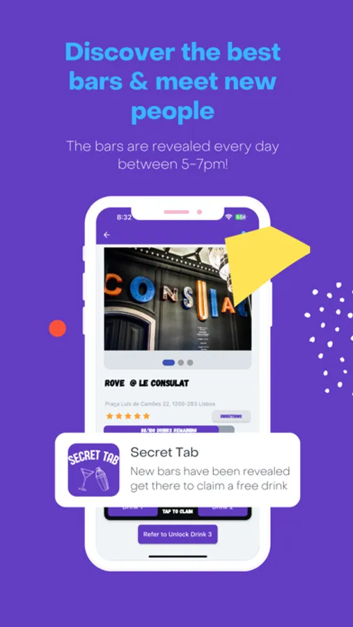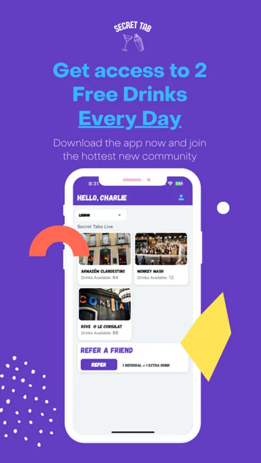 Secret Tab is the new way to discover the best bars in a city, meet new people and save money! You get access to up to 2 Free Drinks every day at different bars across your city.